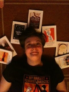 Me, at the end of a long night, with books