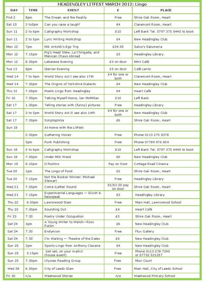 works to improve the environment and facilities for the local community. The LitFest is run by a group of people who are local to Headingley and our idea is that we develop a literature festival that draws on the strengths of our local community to entertain, enlighten and delight us all. But, while our roots lie in our community, it is also our pleasure to invite and offer hospitality to people of the word from around the country and the world. (from their website!)