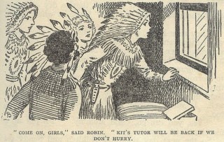 Robin returns home feeling much older and doesn’t want to play with the girls thinking girls can’t catch and wishes for another boy to play with. They are told a new family are coming to stay next door and the children hope, well Robin hopes that it is another boy to play with. They hear a lot of howling from next door and sure enough there is a boy dressed as a Red Indian, we soon discover is They decide they are going to dress up and seek next door to give the boy a fright. However the boy captures them and ties each of them to a tree and disappears. The woman who had been sat reading when they first looked into the garden comes across them and is shocked to find them. They tell her the boy tied them up and she exclaims there never was one. She unties them and tells them never to come back.