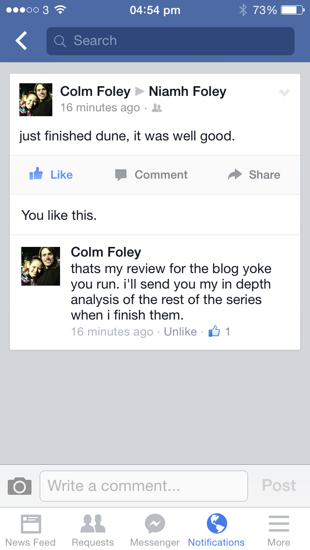 Exciting News – My brothers first LBC review! July 17, 2014June 7, 2020 / Drneevil My little brother has graciously provided this stellar review of the SF epic Dune. DUNE FRANK HERBERT Review submitted via facebook. I’d provide a link for his twitter but he doesn’t believe in it. As in – he disputes its existence altogether. Spread the Word! Click to share on Mastodon (Opens in new window) Mastodon Click to share on WhatsApp (Opens in new window) WhatsApp Click to share on Pocket (Opens in new window) Pocket Click to share on X (Opens in new window) X More Click to email a link to a friend (Opens in new window) Email Click to print (Opens in new window) Print Click to share on LinkedIn (Opens in new window) LinkedIn Click to share on Tumblr (Opens in new window) Tumblr Click to share on Reddit (Opens in new window) Reddit Click to share on Pinterest (Opens in new window) Pinterest Like Loading...