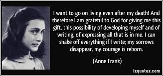 “I have one outstanding character trait that must be obvious to anyone who’s known me for any length of time: I have a great deal of self-knowledge. In everything I do, I can watch myself as if I were a stranger. I can stand across from the everyday Anne and, without being biased or making excuses, watch what she’s doing, both the good and the bad. This self-awareness never leaves me, and every time I open my mouth, I think, ‘You should have said that differently’ or ‘That’s fine the way it is.’ I condemn myself in so many ways that I’m beginning to realize the truth of my Father’s adage: ‘Every child has to raise itself.’ Parents can only advise their children or point them in the right direction. Ultimately, people shape their own characters. In addition, I face life with an extraordinary amount of courage. I feel so strong and capable of bearing burdens, so young and free! When I realised this, I was glad, because it means I can more easily withstand the blows life has in store.”