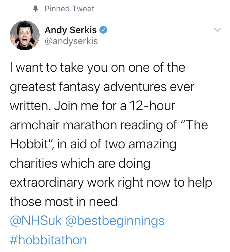 Am hugely excited to see that Andy Serkis will be reading The Hobbit to fundraise for the NHS Charities Together and Best Beginning charity.